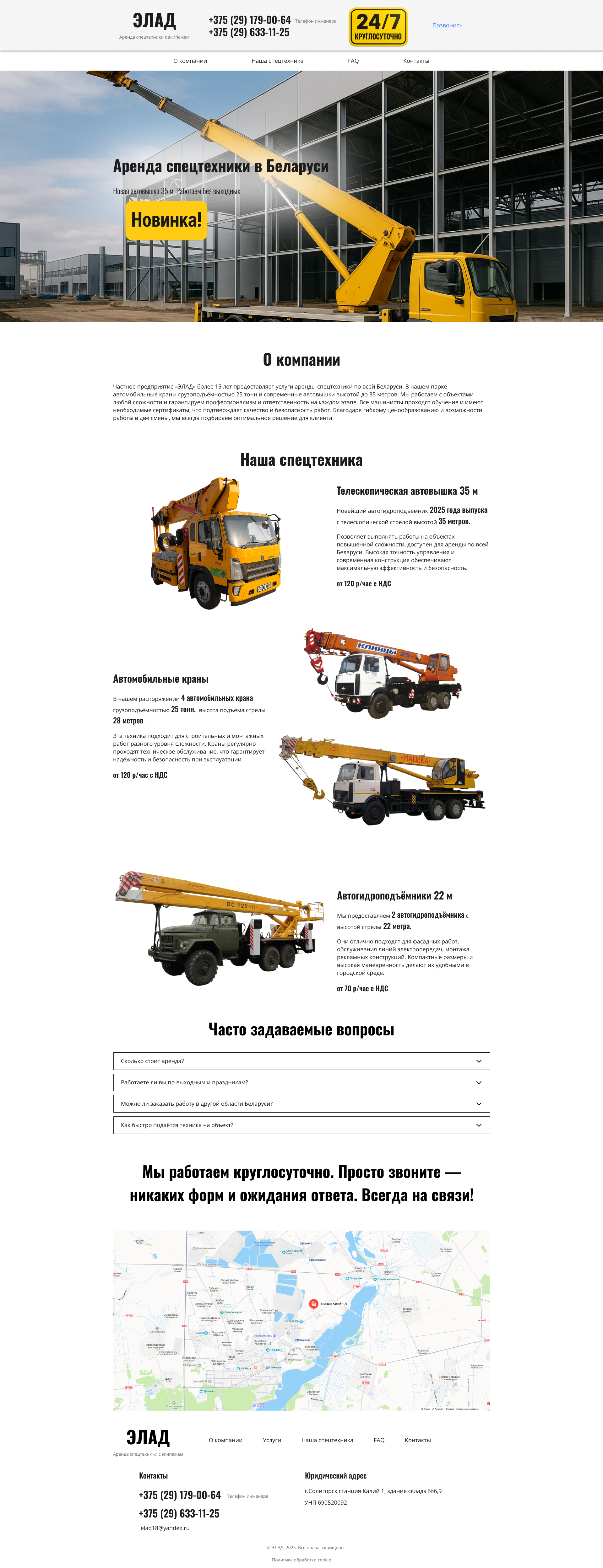 Разработка одностраничного сайта для компании Элад — предоставляющая услуги аренды строительной и дорожной спецтехники по всей Беларуси.