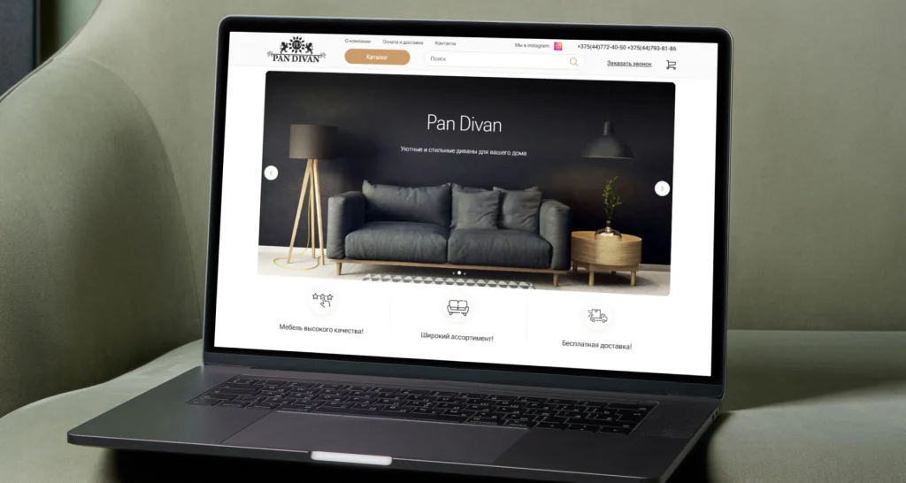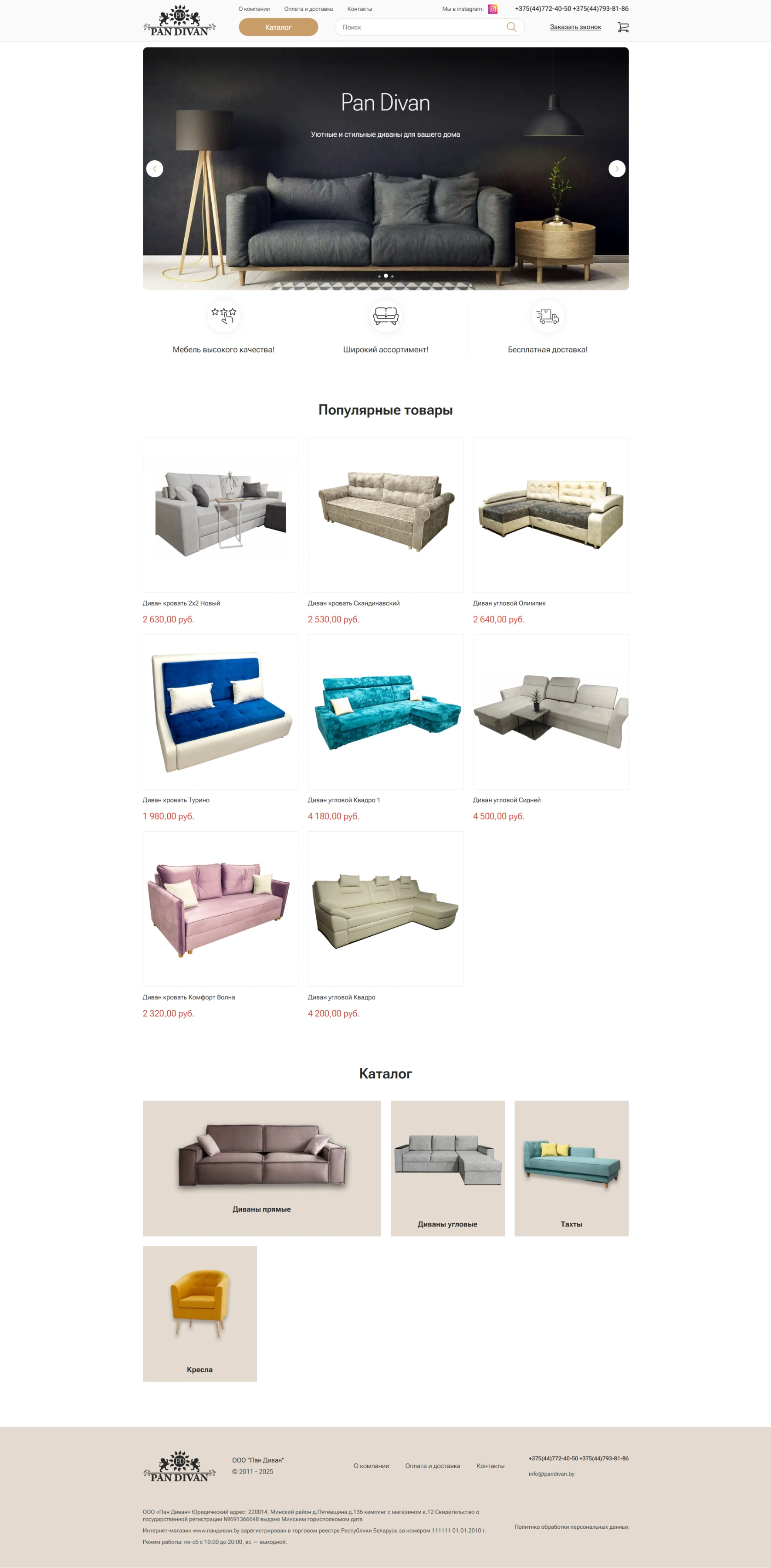Разработка интернет-магазина для производителя диванов с 12-летней историей. Компания «Пан Диван» специализируется на производстве качественных диванов различных моделей — от классических до современных, от угловых до раскладных. Производитель использует натуральную древесину, высокопрочные ткани и современные наполнители, обеспечивая долговечность и комфорт своей продукции.